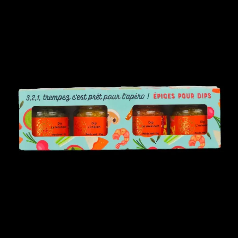 Vous trouverez à l’intérieur de ce coffret 4 mélanges d’épices aux saveurs des 4 coins du monde pour préparer une sauce dips originale. Optez ainsi pour le dip mexicain avec son guacamole, le nordique aux herbes aromatiques pour y tremper crudités ou saumon, l’indien relevé à base de curry et piment fort, ou encore l’oriental et son mélange d’épices grillées et piquantes.