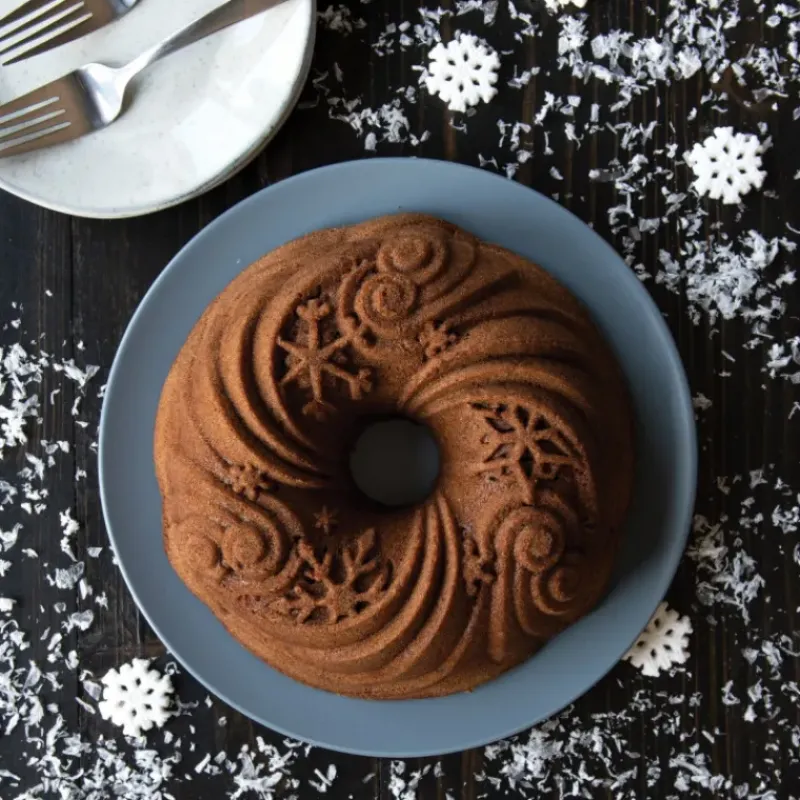 Il ne vous restera ensuite qu’à ajouter une pluie de sucre glace sur votre gâteau pour accentuer l’effet de neige, ou encore repasser sur les contours des flocons avec un stylo en chocolat ou du glaçage. Une fois déposé à table, votre gâteau Bundt aura fière allure et fera briller d’envie les yeux de vos convives.
