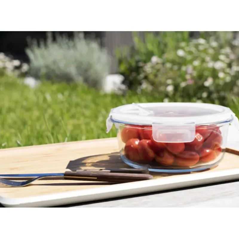 Le récipient de la boîte hermétique est en verre borosilicate sans Bisphénol A (BPA), offrant une grande résistance aux chocs thermiques. Ainsi, la boîte en verre passe au réfrigérateur, au congélateur, au four (sans couvercle) et au micro-ondes avec la valve vapeur ouverte, située sur le couvercle.