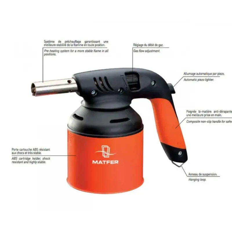Le chalumeau à gaz Matfer est vendu sans cartouche de gaz. Les cartouches adaptées à ce chalumeau sont les cartouche à gaz – Stop Gaz – pour chalumeau Matfer.