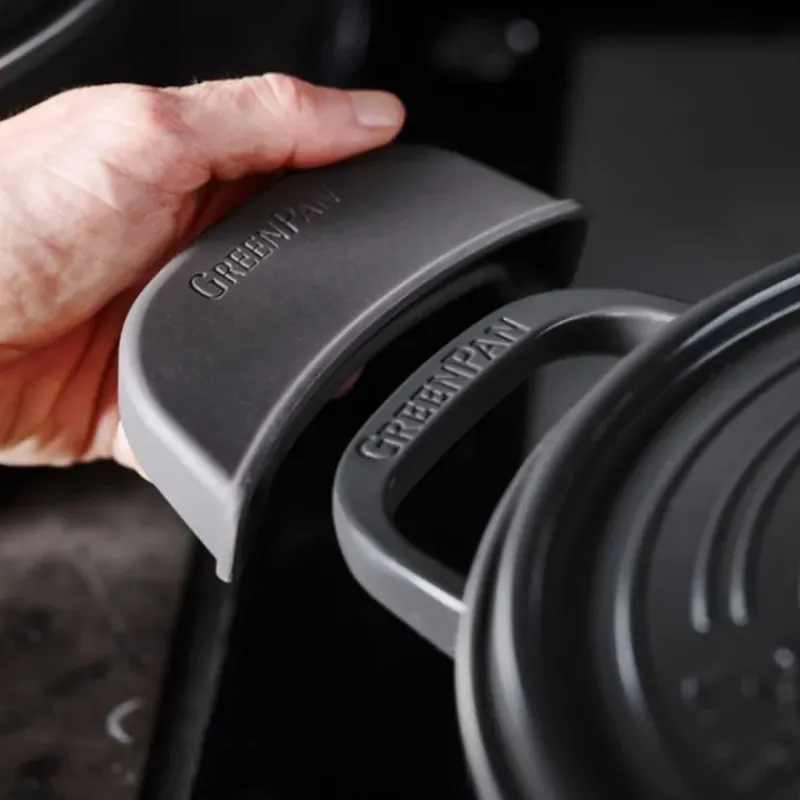 Deux maniques en silicone sont proposées avec la cocotte en fonte d’aluminium CELESTE GreenPan, pour une manipulation en toute sécurité.