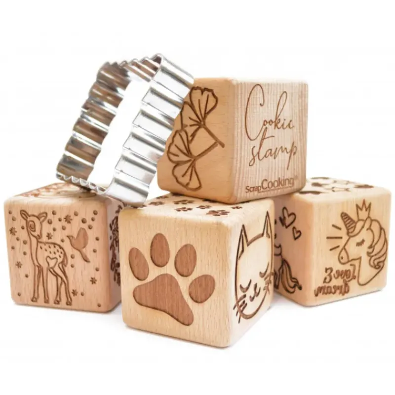 Si vous aimez le Printemps & la nature, personnalisez vos biscuits avec le cube en bois dont 5 faces proposent des motifs différents : des coquelicots, des feuilles, des petites fleurs ou encore l’inscription « flower » (fleur) entourée d’une couronne fleurie. Adapté aux dimensions du tampon biscuit, le découpoir pâtisserie est en acier inoxydable et au contour cannelé. Il permettra de découper les petits gâteaux d’un seul geste, après avoir imprimer le motif de votre choix sur la pâte, grâce au tampon à biscuit.