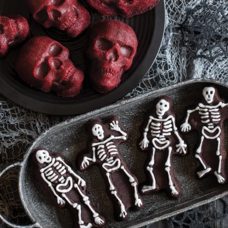 Agrémentez vos décorations d’Halloween de squelettes aux postures comiques que vos invités pourront dévorer grâce au moule à gâteaux squelettes Nordic Ware.