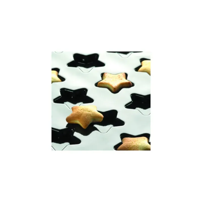 Ce moule fabriqué en France de 60 x 40 cm comporte 24 empreintes en forme d’étoile afin de réaliser des entremets, ou encore des mousses, de grande qualité. Ce moule en silicone alimentaire et fibres de verre est à la fois souple et robuste : il passe au four comme au congélateur.