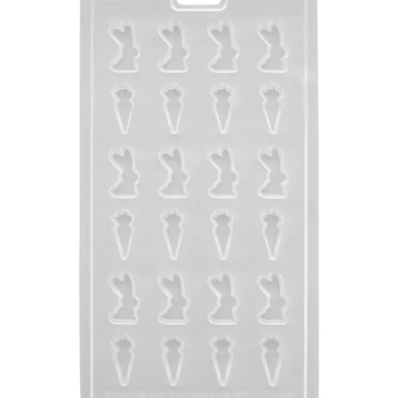 Doté de 24 cavités de 2 formes différentes ce moule à chocolat est idéal pour créer des petits lapins et carottes sucrés en guise de chocolats de Pâques. Avec ces empreintes d’environ 3 cm vous pourrez faire fondre du chocolat ou encore des pistoles déco melts pour obtenir des bonbons colorés.