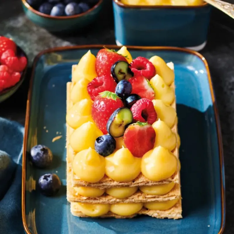 Tartes aux fruits, brioche, choux, mille-feuilles : garnissez vos pâtisseries préférées avec cette délicieuses Préparation pour Crème Pâtissière 1 kg Funcakes. Elle pourra également servir de fourrage ou de nappage puisqu’elle peut passer au four.